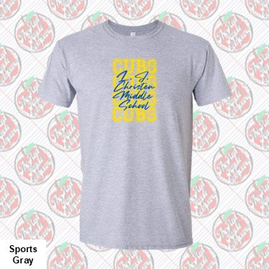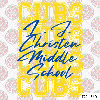 Stacked in strong yellow varsity lettering with a rugged vintage texture, the word “CUBS” dominates the background while “J. Christen Middle School” flows confidently across the front in dynamic blue script. It’s not just a look — it’s an identity.