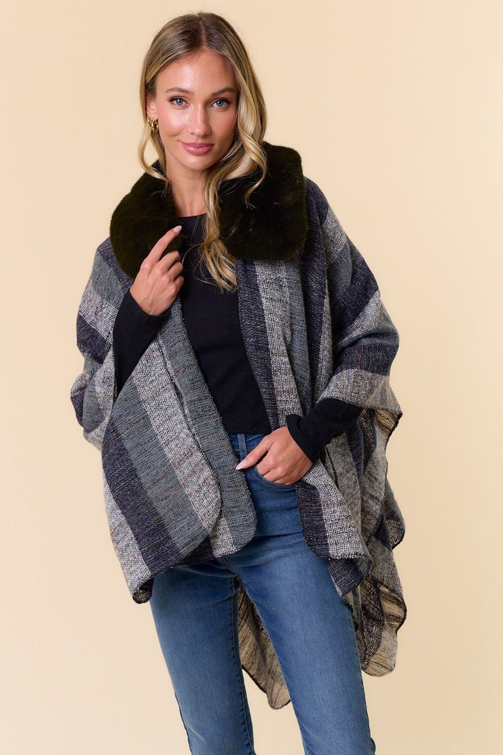 Faux Fur Trim Stripe Shawl Wrap