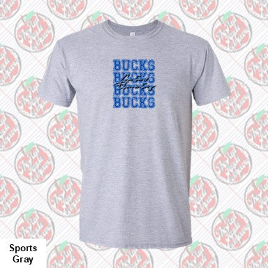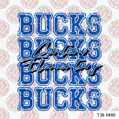 This bold and clean Centeno Elementary spirit shirt design features a repeating "BUCKS" block pattern in distressed royal blue varsity-style lettering, stacked across the entire background for a powerful, eye-catching effect. Layered on top is “Centeno Elementary” in an elegant white and blue script font, creating a sleek contrast that pops off the background. The combo of tough athletic lettering and smooth school script delivers the perfect mix of tradition and trend — just like Centeno itself!